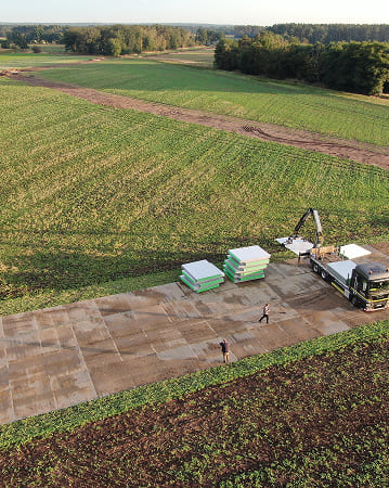 ECOTraxx24 Panels verfügen über eine optimierte Tragfähigkeit und sind speziell für den Einsatz im Schwerlastverkehr entwickelt. Dank ihres modularen Designs mit Nut-Feder-Verbindung lassen sie sich schnell verlegen und ebenso zügig wieder abbauen – ideal für dynamische Projektverläufe mit wechselnden Anforderungen.